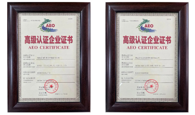 为高质量推进海关信用制度建设,推动便利化监管措施落实落细,进一步提升海关政策辐射带动作用,推动地方经济高水平开放、高质量发展。5月23日,青岛海关联合中国报关协会、烟台市人民政府在山东烟台共同举办“携手跨万亿 扬帆新征程”海关政策宣讲暨深化AEO示范市建设大会。中宠股份旗下子公司——烟台爱丽思中宠食品有限公司、烟台好氏宠物食品科技有限公司在大会现场正式获颁海关AEO高级认证企业证书。