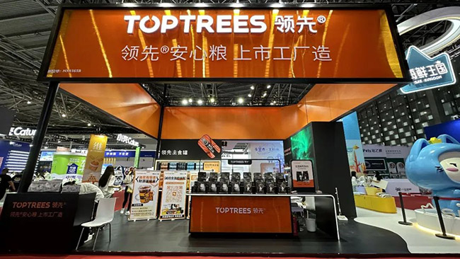 Toptrees领先®以“领先®安心粮,上市工厂造”为展区主题,以黑橙品牌色为视觉基调,同时搭配主粮系列多区位展示,贯彻“聚焦主粮”的集团策略,参展观众可以通过展示区探索,获取不同主粮的差异化营养配比及功效。