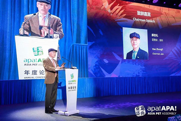 上午9点,亚洲宠物盛典正式开幕,APA亚宠会会长,中宠股份董事长郝忠礼上台致辞。