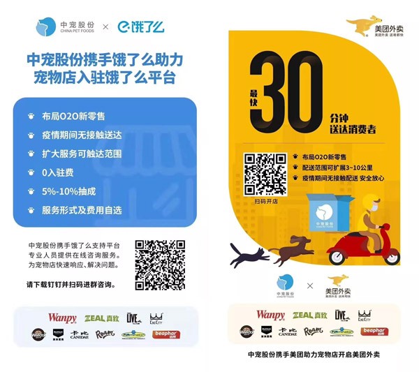 中宠已携手饿了么,美团外卖的平台共同响应宠物行业在非常时期的新零售布局,帮助门店扩大本地化服务触达范围,保障疫情期间的无接触配送,安全放心。凡入驻平台的宠物店都有专业人员在线提供咨询服务,为宠物店快速响应,解决问题。同时还有更多新零售渠道入驻正在洽谈中。